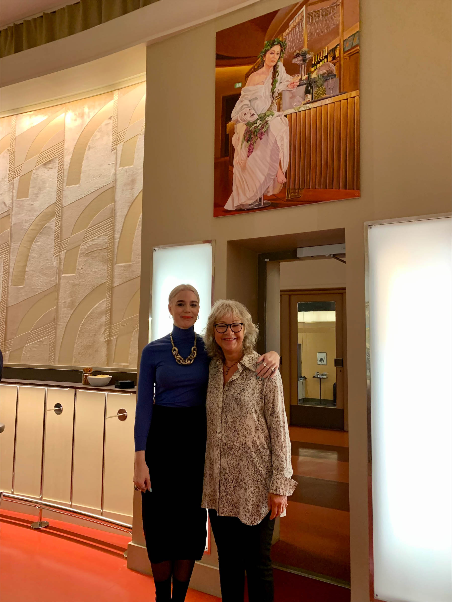 Medel ur Teaterfonden har bland annat bekostat målningen "Thalia" av konstnären Lovisa Sköld. På bilden ses Lovisa Sköld med skådespelare Marie Delleskog som suttit modell för målningen. Fotot är taget under vernissagen i bar Thalia 9 september 2022.